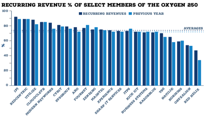 Among the Oxygen 250 firms who broke out the figure across two sets of accounts, average recurring revenue levels rose from 72% to 74% year on year (see below).